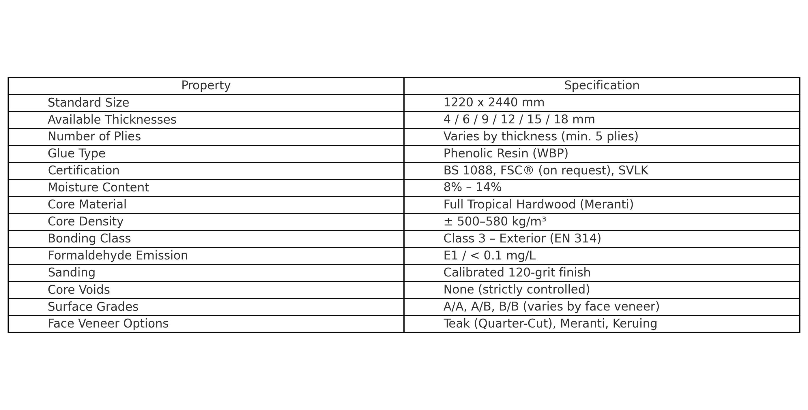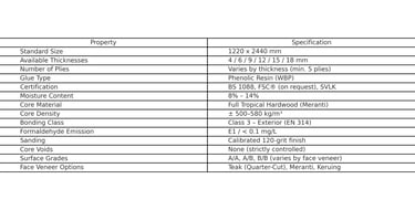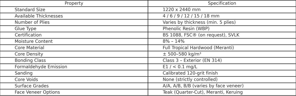 Our marine plywood stands out for three reasons: no core voids, mono-species construction, and exceptional dimensional stability. Unlike other panels that may hide soft patches, gaps, or mixed wood layers, our plywood is built with a full Meranti core — a dense, lightweight tropical hardwood — and laminated using phenolic waterproof glue for long-term durability. This uniform structure ensures no internal weak spots, perfect balance, and minimal risk of warping or delamination. Combined with our quarter-sawn teak veneers, it delivers a flawless surface and long-lasting performance, ideal for yacht interiors and marine-grade applications where strength and aesthetics are essential.