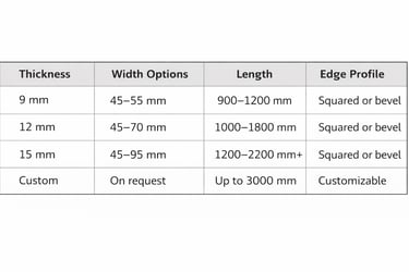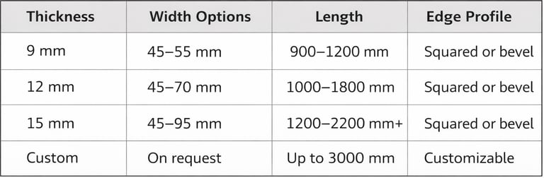 Squared or bevelled edge profiles are standard. Custom profiles can be machined depending on project needs.