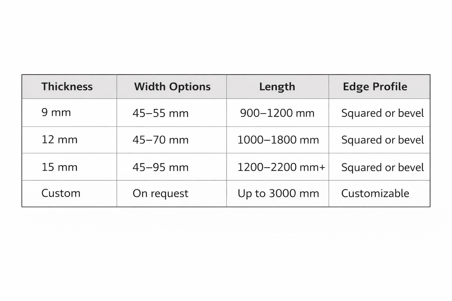 Squared or bevelled edge profiles are standard. Custom profiles can be machined depending on project needs.